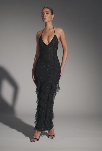 Équilibre parfait entre le sulfureux et le féminin, la robe longue Jazzline est intemporelle. Conçue dans notre tissu en maille 20D de qualité supérieure, Jazzline est ornée de perles et de cristaux sur tout son pourtour, d'un décolleté dos nu plongeant et de volants des hanches jusqu'à l'ourlet.